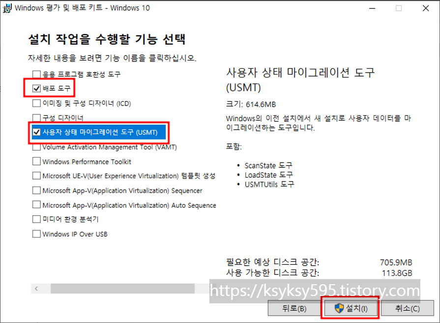설치 옵션에서 [배포 도구] & [사용자 상태 마이그레이션 도구 (USMT)] 를 선택 후, [설치]를 클릭합니다.