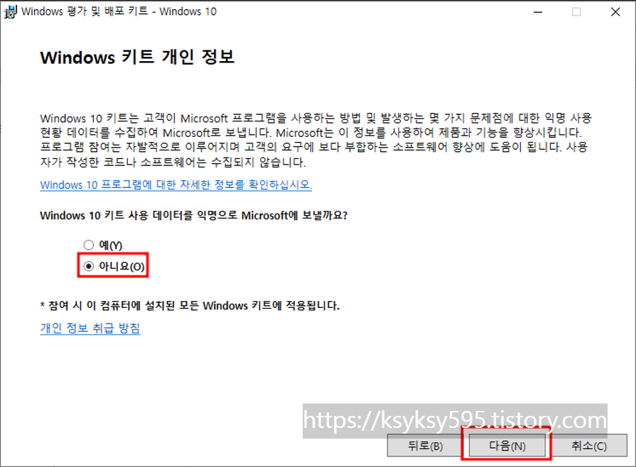 [Windows 10 키드 사용 데이터를 Microsoft에 보낼까요?] 옵션을 [아니요]로 설정 후, [다음]을 클릭합니다.