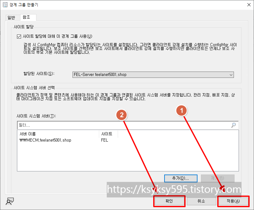 [사이트 시스템 서버]가 추가된 것을 확인 후, [적용] --> [확인]을 클릭합니다.
