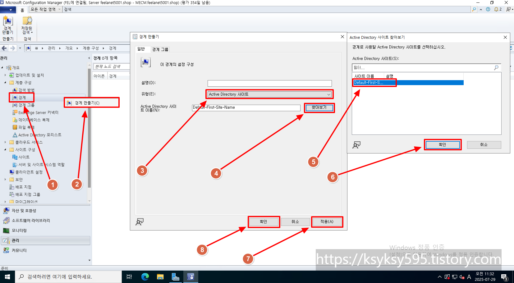[경계]를 우 클릭 후, [경계 만들기]를 클릭합니다. [유형]을 [Active Directory 사이트]를 선택 후, [찾아보기]를 클릭합니다. [Default-First-Site-Name]을 선택 후, [확인]을 클릭합니다. 사이트가 추가되면, [적용] --> [확인] 을 클릭합니다.