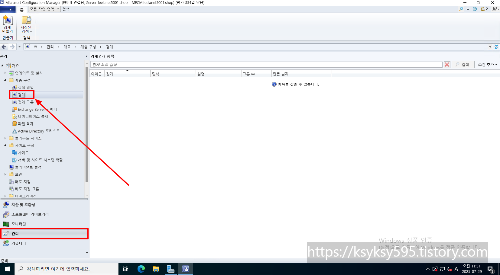 콘솔이 열리면, [관리] --> [계층 구성] --> [경계]으로 이동합니다.