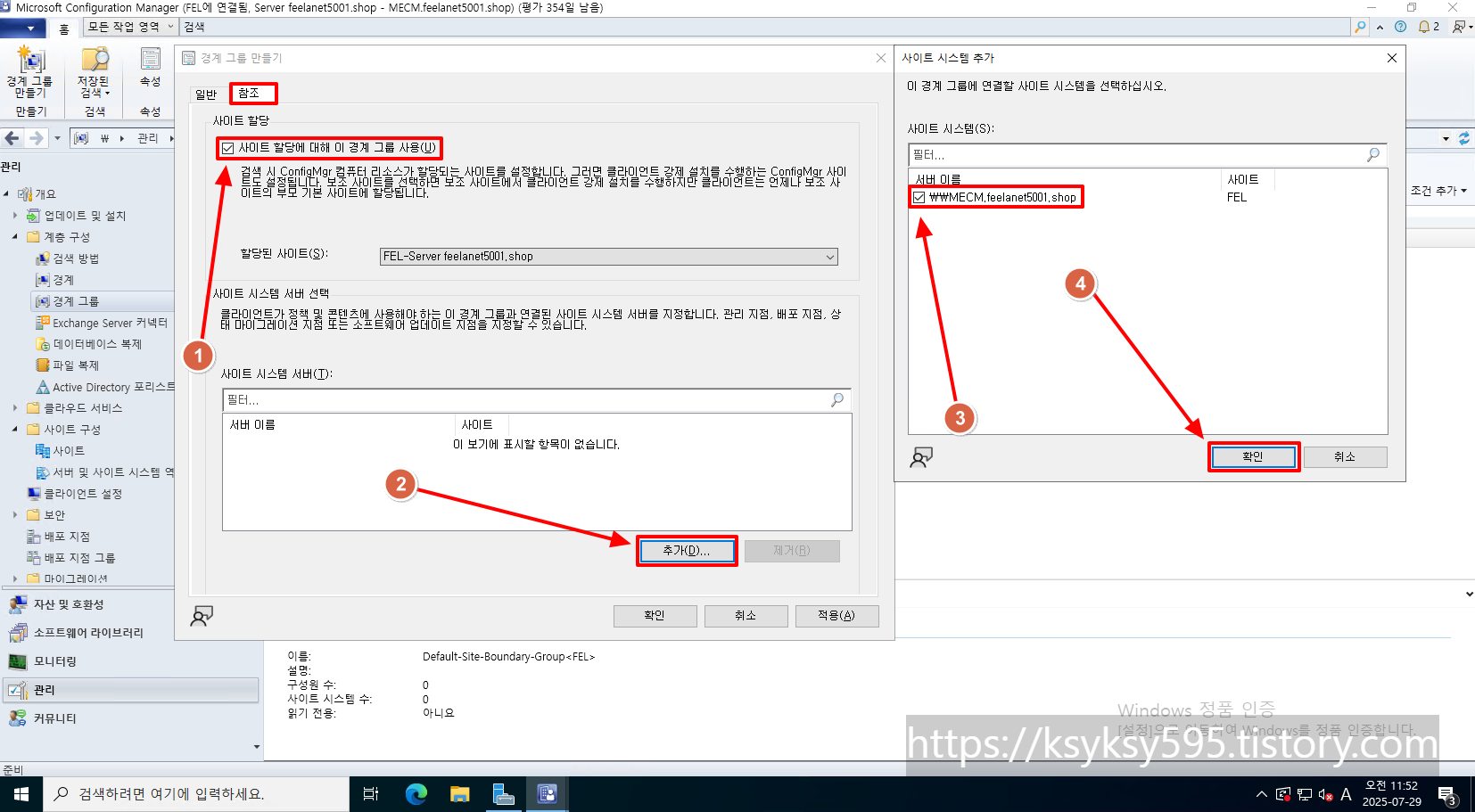 [참조] 탭에서 [사이트 할당에 대해 이 경계 그룹 사용]을 선택 후, [추가]를 클릭합니다. [사이트 시스템]을 선택 후, [확인]을 클릭합니다.