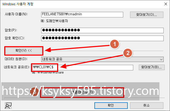[확인]을 눌러서 확장을 합니다. [네트워크 공유] 입력란에, 클라이언트 에이전트 설치할 클라이언트 Host명을 입력하여, [연결 테스트]를 진행합니다.