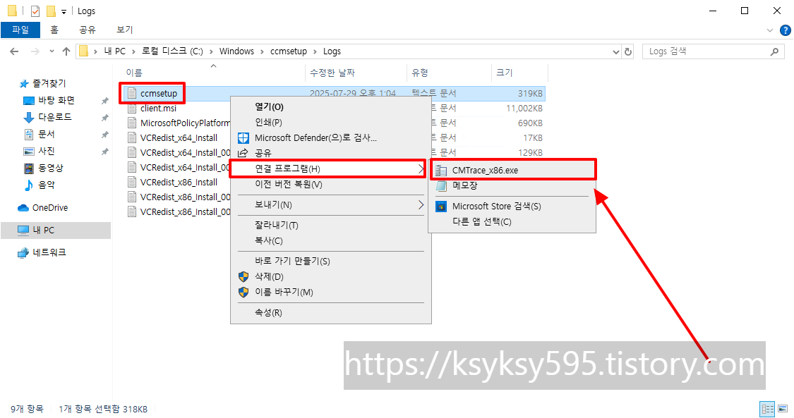 그다음, 다시 ccmsetup 로그가 있는 곳으로 이동하여, 우 클릭 후 [연결 프로그램] --> [CMTrace_x86.exe]로 실행해 주세요!