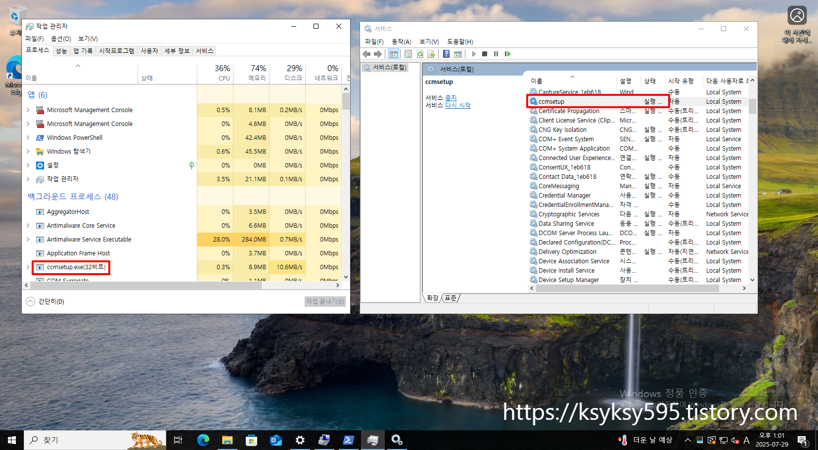 클라이언트에서는 에이전트 설치를 위해, ccmsetup이라는 서비스가 생성되었으며, 실행 중이네요!