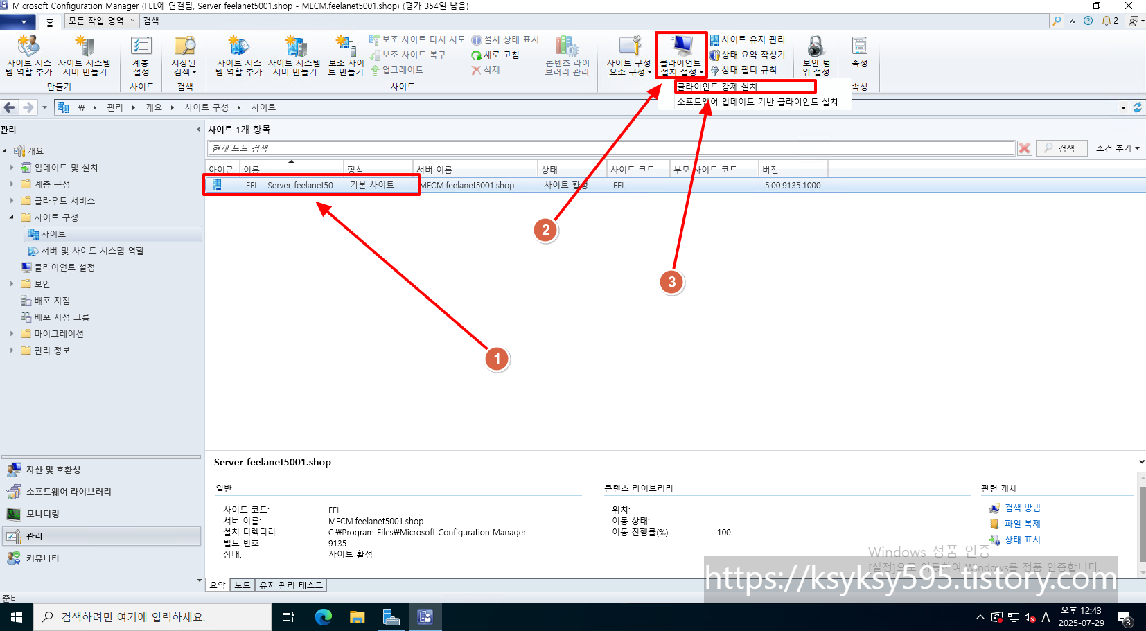 MECM 서버 콘솔에서도 클라이언트 에이전트가 정상적으로 설치된 것을 확인할 수 있습니다.