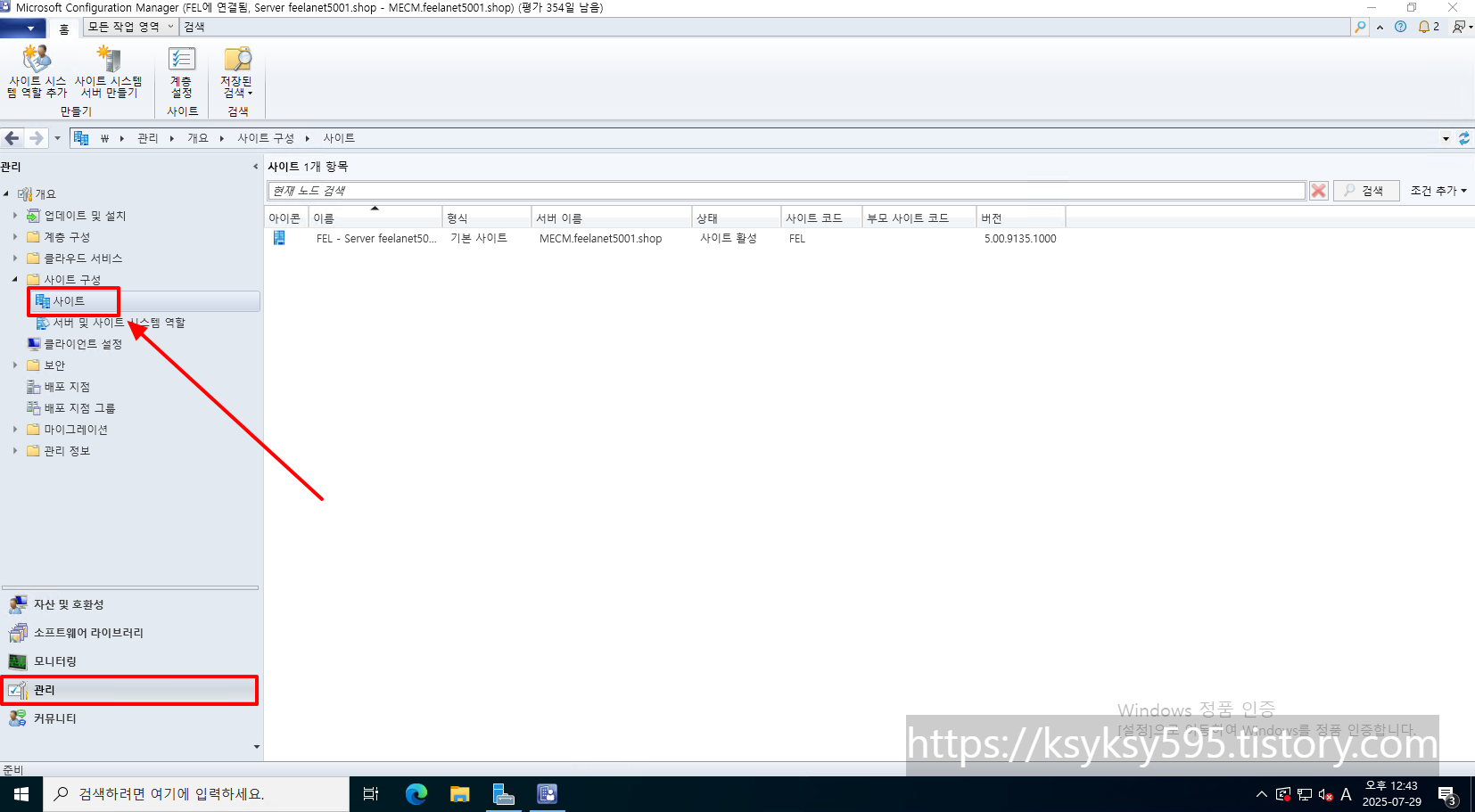 콘솔이 열리면, [관리] --> [사이트 구성] --> [사이트]로 이동합니다.