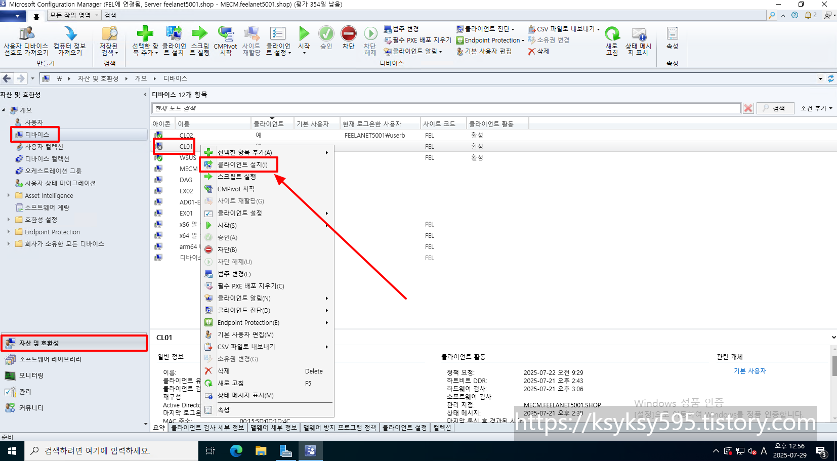 [자산 및 호환성] 탭으로 이동 후, [개요] --> [디바이스]에서 에이전트를 설치할 클라이언트를 우 클릭 후, [클라이언트 설치]를 클릭합니다.