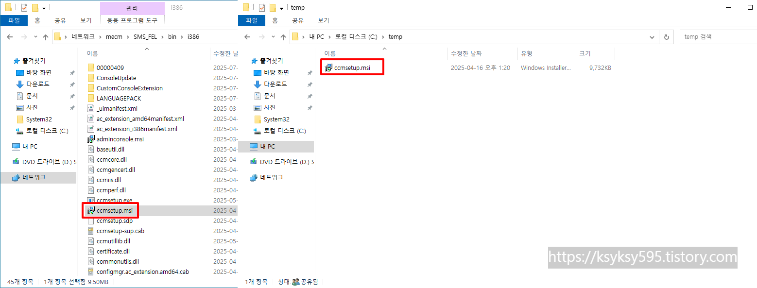 MECM 서버에 있는 ccmsetup.msi 파일을 공유 폴더로 가져옵니다. (클라이언트가 공유 폴더에 접근 가능해야 합니다.)