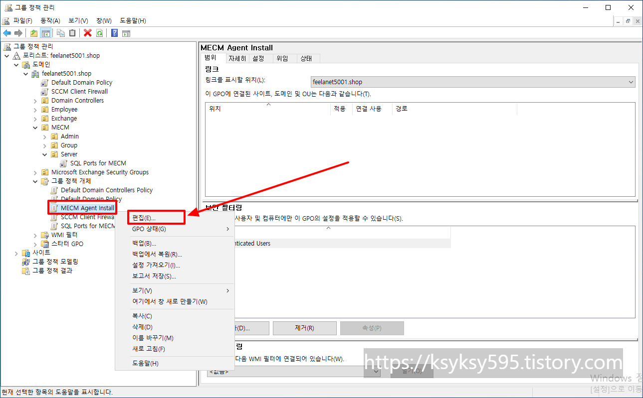 그룹 정책 관리를 실행하여, 정책을 생성 후 [편집]을 클릭합니다.