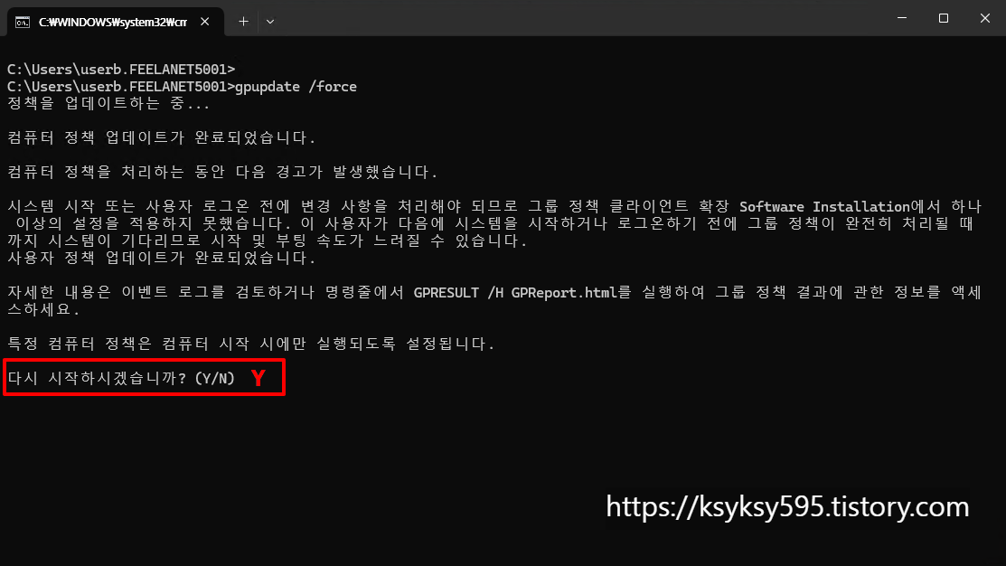 클라이언트가 정책을 받아오면, 재부팅을 진행해야 합니다.