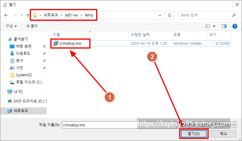 경로를 ccmsetup.msi 파일이 있는 공유 폴더로 이동 후, 선택하여 [열기]를 클릭합니다.