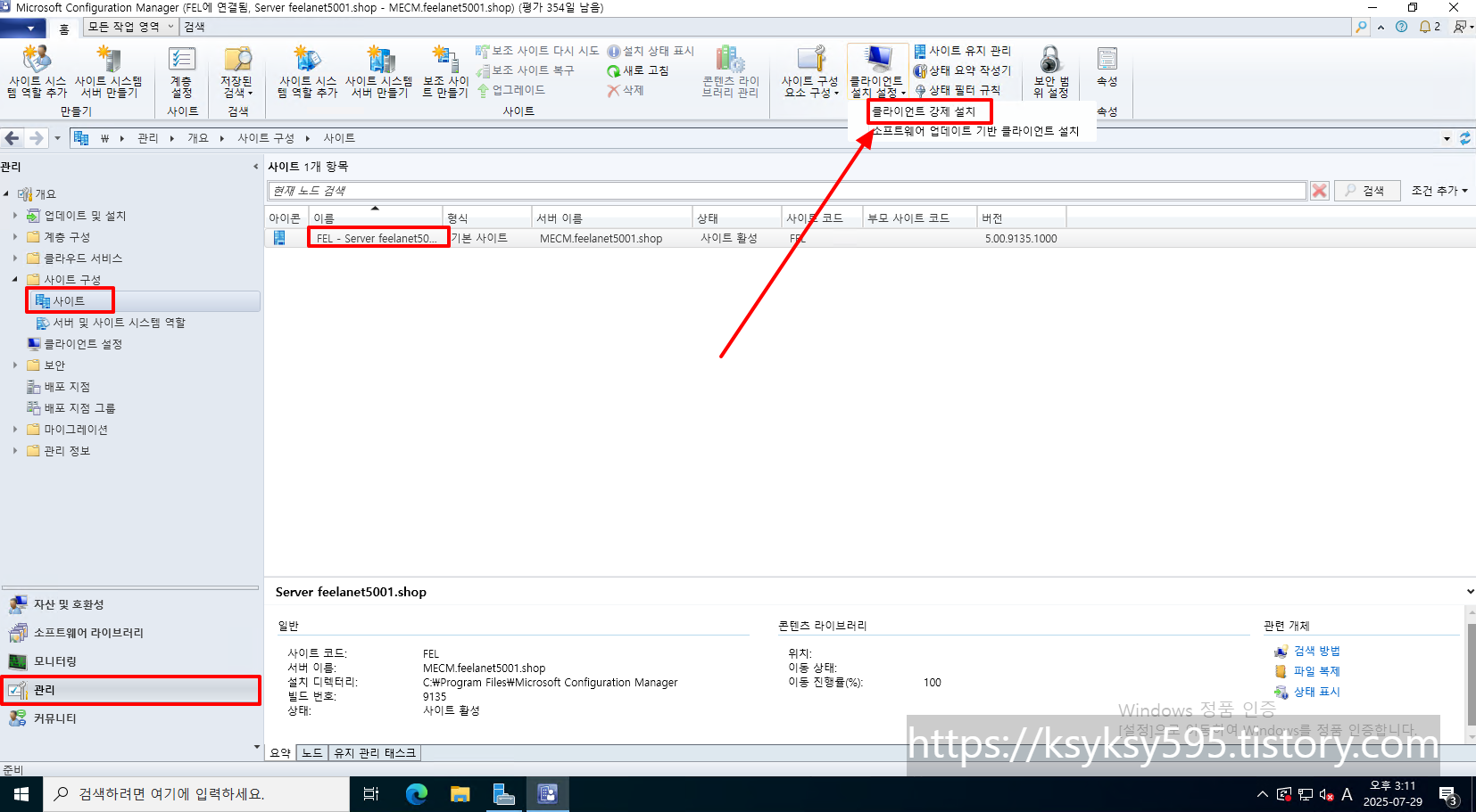 [관리] 탭에서 [사이트 구성] --> [사이트]로 이동 후, 기본 사이트를 선택하여, 우측 상단에 [클라이언트 강제 설치]를 클릭합니다.