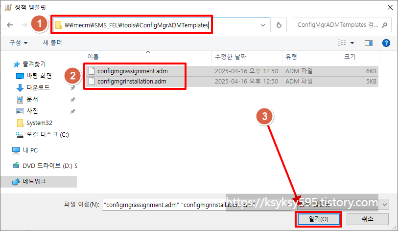 MECM 서버에 있는 템플릿을 가져와야 합니다. 아래 경로로 접근하여, [configmgr~. adm] 템플릿 두 개를 가져옵니다.