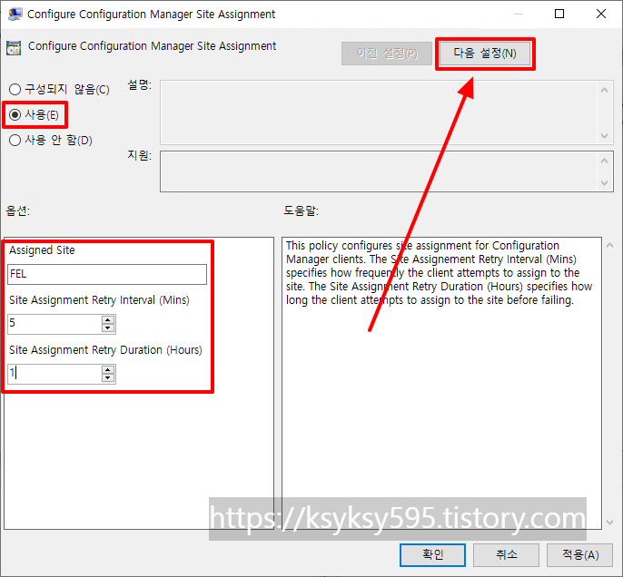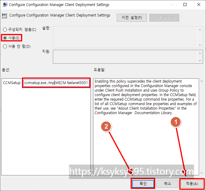 [사용]으로 변경 후, CCMSetup 값에 아래와 같이 입력합니다.