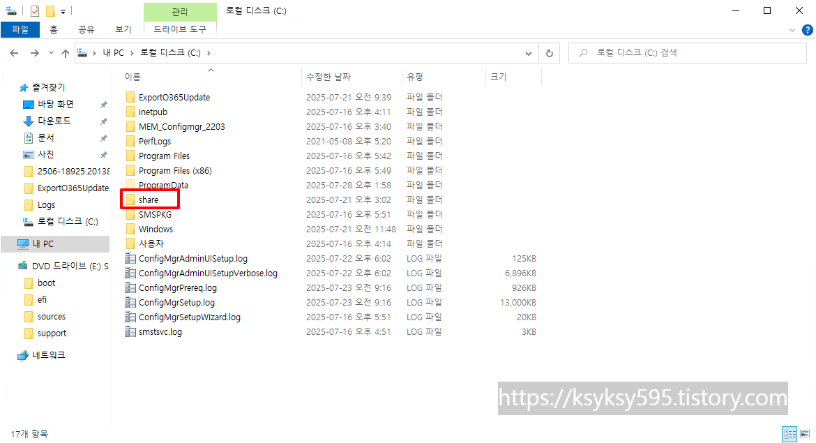 MECM (구 SCCM) 서버에서 공유 폴더 하나를 생성합니다.