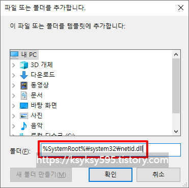 폴더 위치를 아래와 같이 입력 후, [확인] 을 클릭합니다.