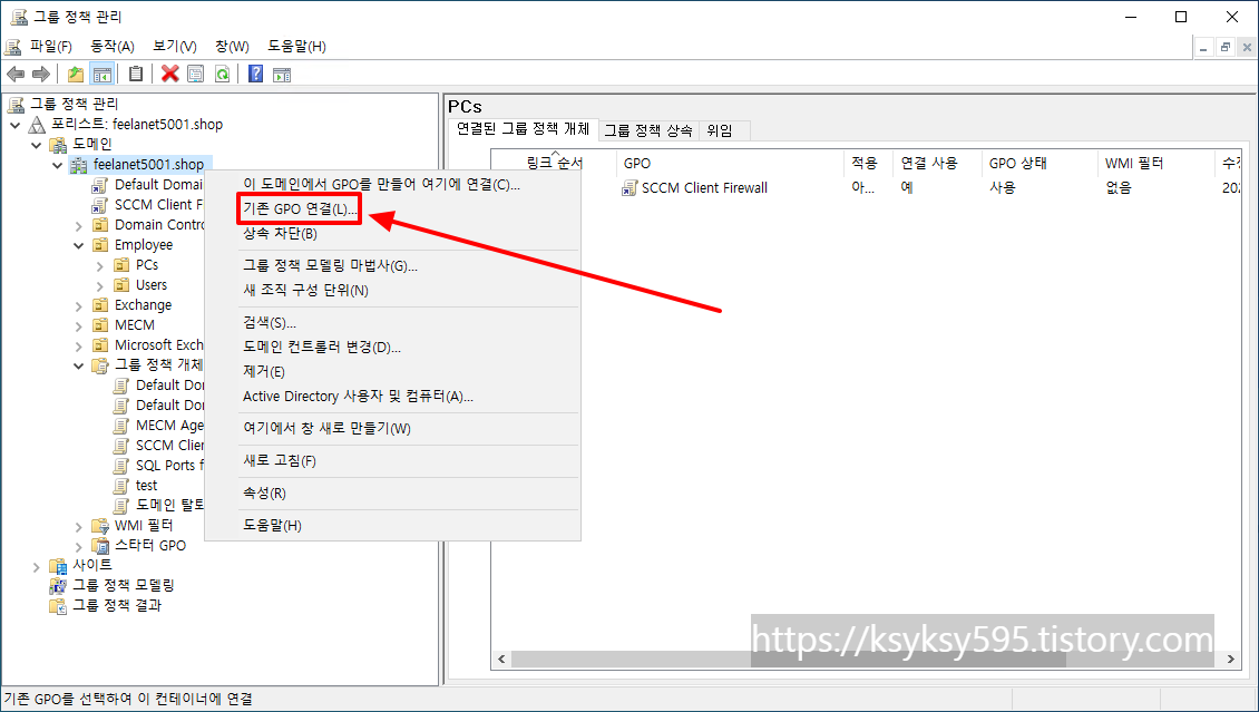 [그룹 정책 관리] 에서 정책을 적용 할 OU 를 우 클릭 후, [기존 GPO 연결] 을 클릭합니다.