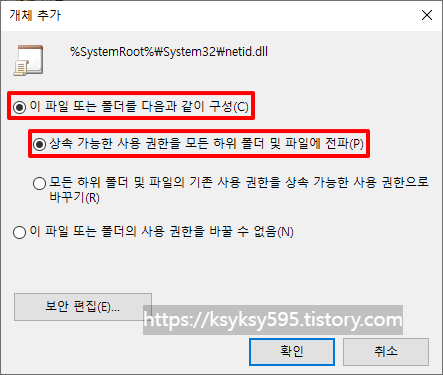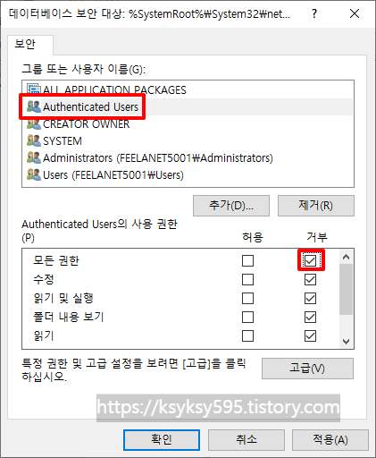 [Authenticated Users] 그룹을 추가 후, [모든 권한] 의 [거부] 를 체크합니다.