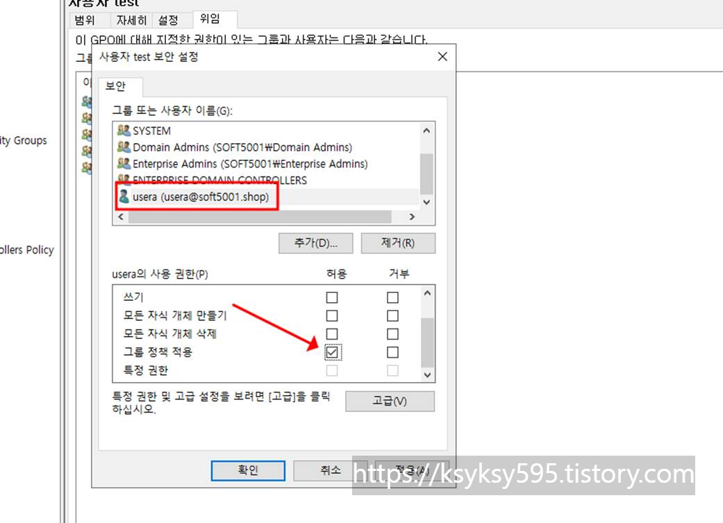 추가한 사용자에 대한 권한 [그룹 정책 적용] 권한을 [허용] 체크를 진행합니다.
