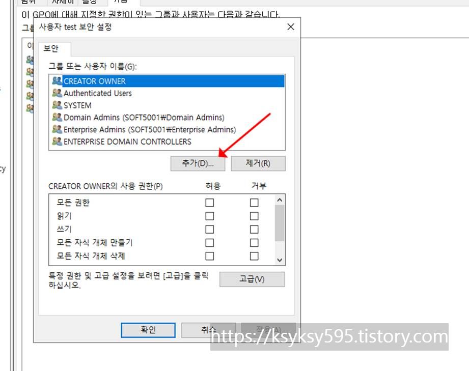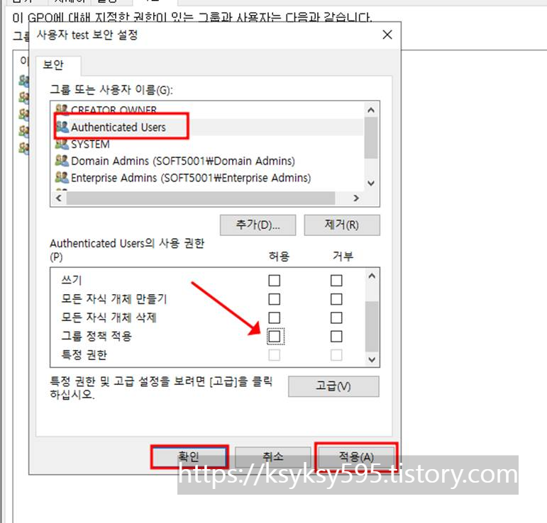 기존에 있는 [Authenticated Users] 그룹에 대한 [그룹 정책 적용] 허용 체크를 해제 후 적용합니다.