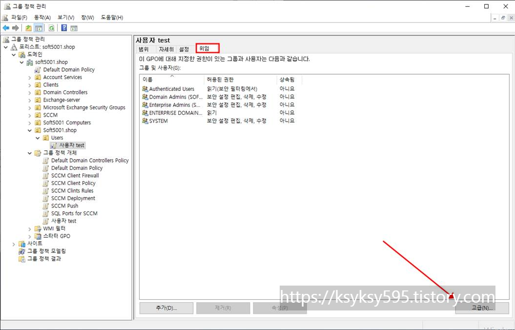 정책 클릭 -> [위임] 탭 클릭 -> 우측 하단 [고급] 클릭