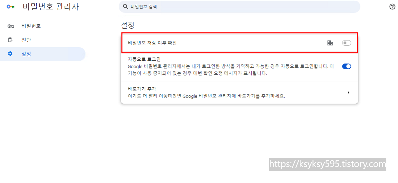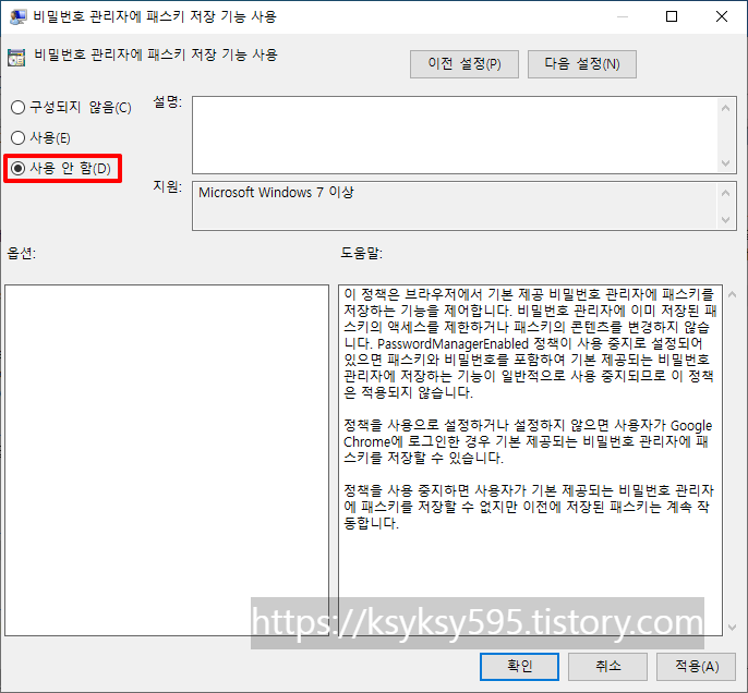 정책이 적용되면, 아래와 같이 [비밀번호 저장 여부 확인] 이 비활성화 되어있습니다.