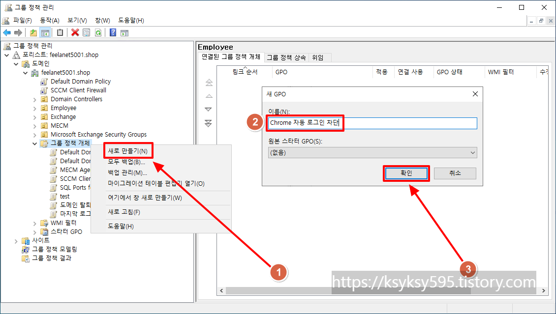 [그룹 정책 개체] 를 우 클릭 후, [새로 만들기] 를 클릭 후, 정책 [이름] 을 입력합니다.