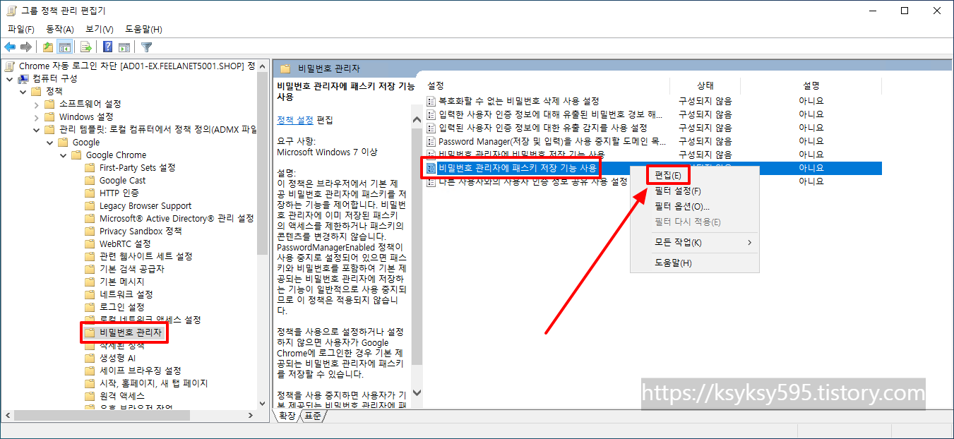 [컴퓨터 구성] --> [정책] --> [관리 템플릿] --> [Google] --> [Google Chrome] --> [비밀번호 관리자] 로 이동 후, [비밀번호 관리자에 패스키 저장 기능 사용] 을 우 클릭 하여, [편집] 을 클릭합니다.