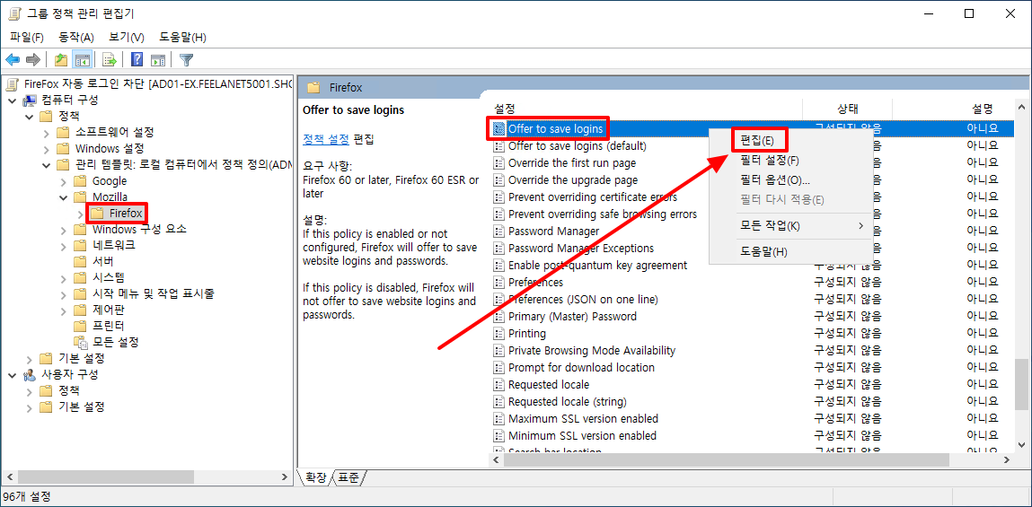 [컴퓨터 구성] --> [정책] --> [관리 템플릿] --> [Mozilla] --> [Firefox] 에서 [Offer to save logins] 을 우 클릭 후, [편집] 을 클릭합니다.