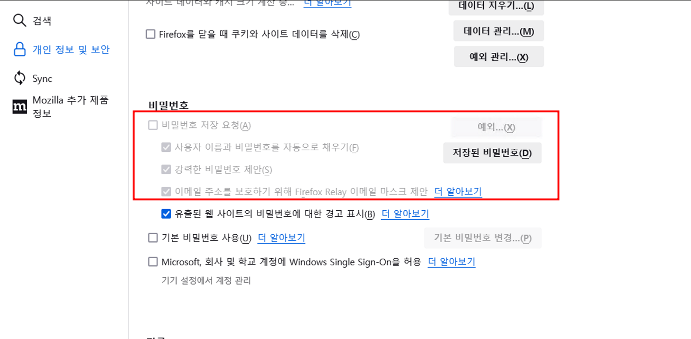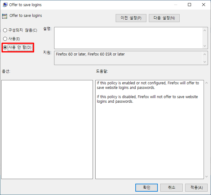 정책이 적용되면 [비밀번호 저장] 이 비활성화됩니다.