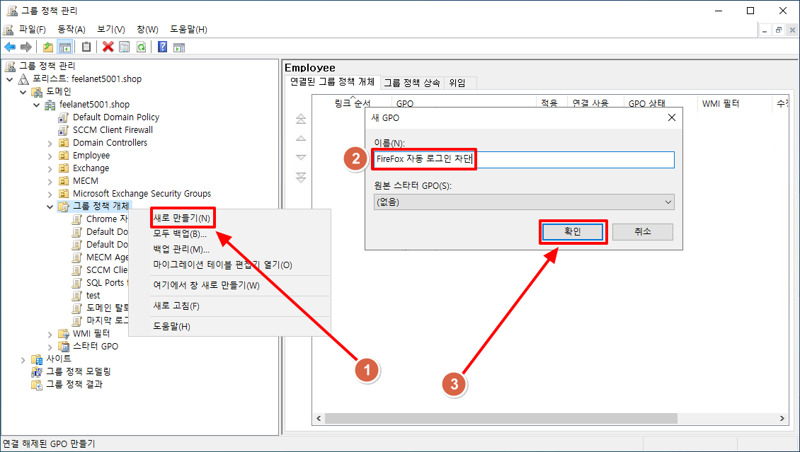 [그룹 정책 개체] 를 우 클릭 후, [새로 만들기] 를 클릭 후, 정책 [이름] 을 입력합니다.