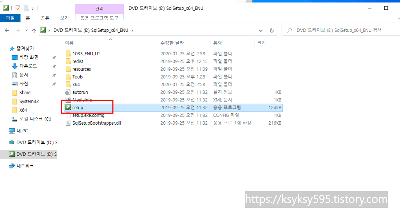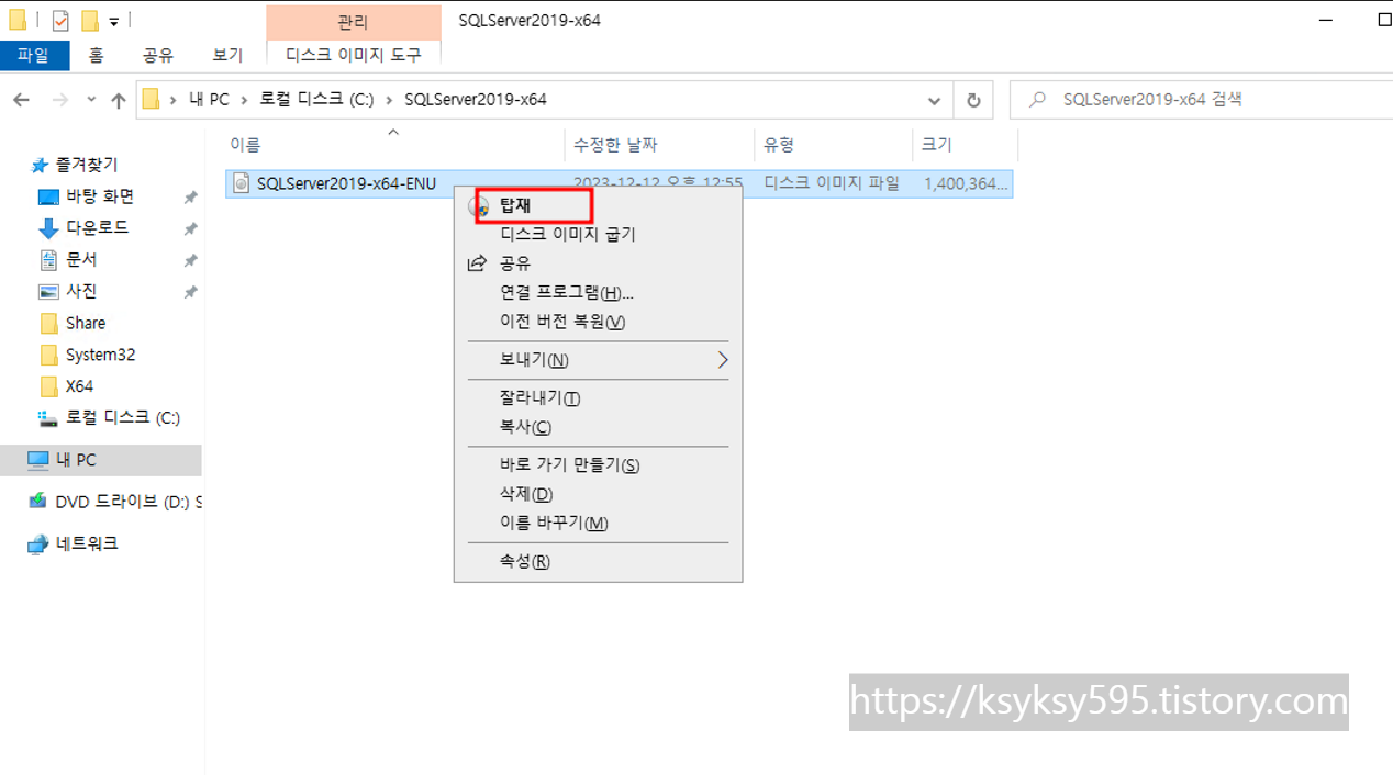 MECM 서버에서 SQL Server iso 를 탑재시켜 줍니다.