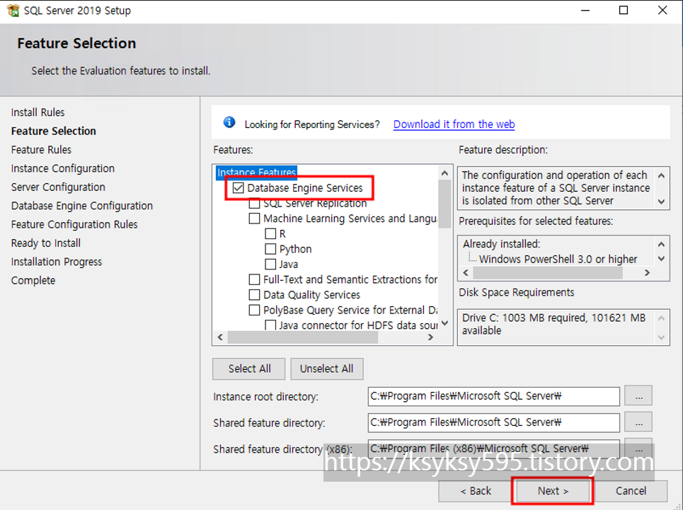 인스턴스 기능에서 [Database Engine Services]를 선택 후, [Next]를 클릭합니다.