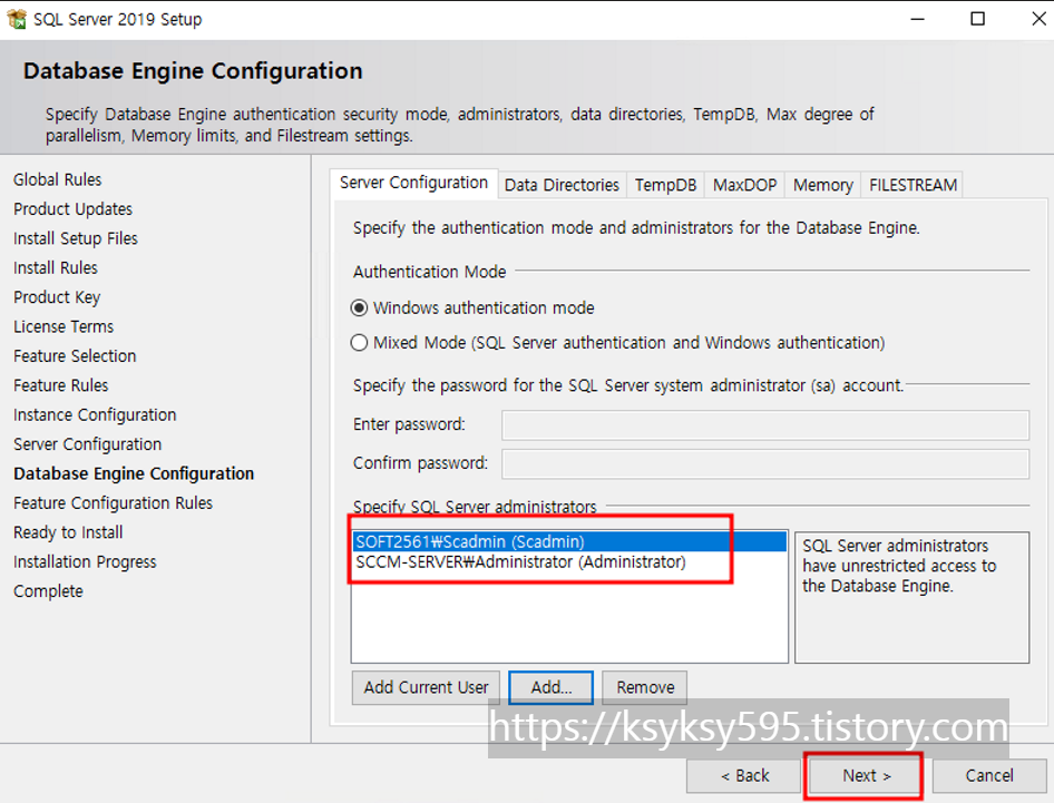 [SQL Server administrators]에서 MECM 관리자 계정이랑 MECM 서버 로컬 관리자 계정을 추가합니다.