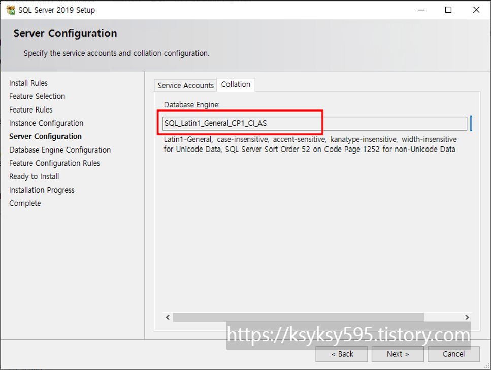 [Collation]에서는 [SQL_Latin1_General_CP1_CI_AS]를 선택 후, [Next]를 클릭합니다.