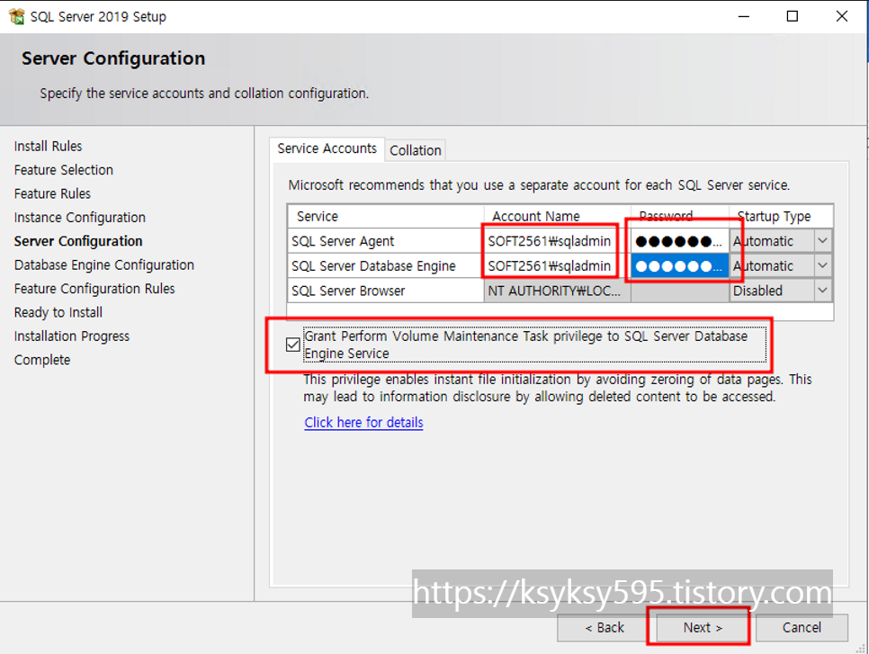 [SQL Server Agent] & [SQL Server Database Engine] 서비스에 SQL 서비스 계정을 입력합니다.
