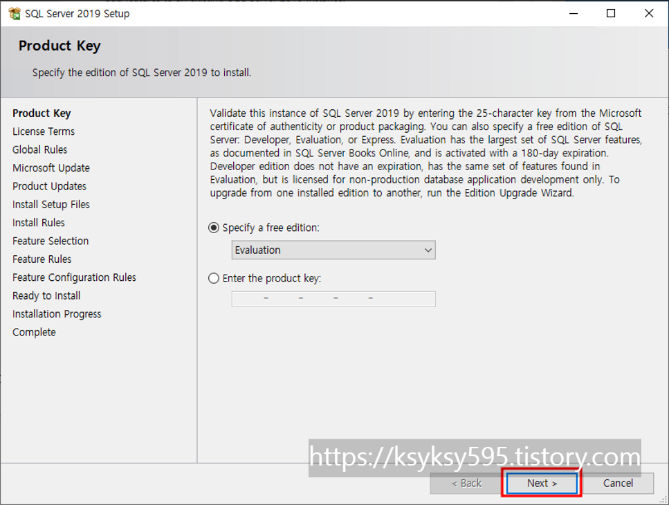 제품 키를 입력 후, [Next]를 클릭합니다.
