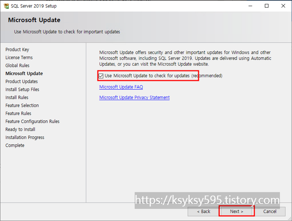 [Microsoft Updates Check] 체크 후, [Next] 를 클릭합니다.
