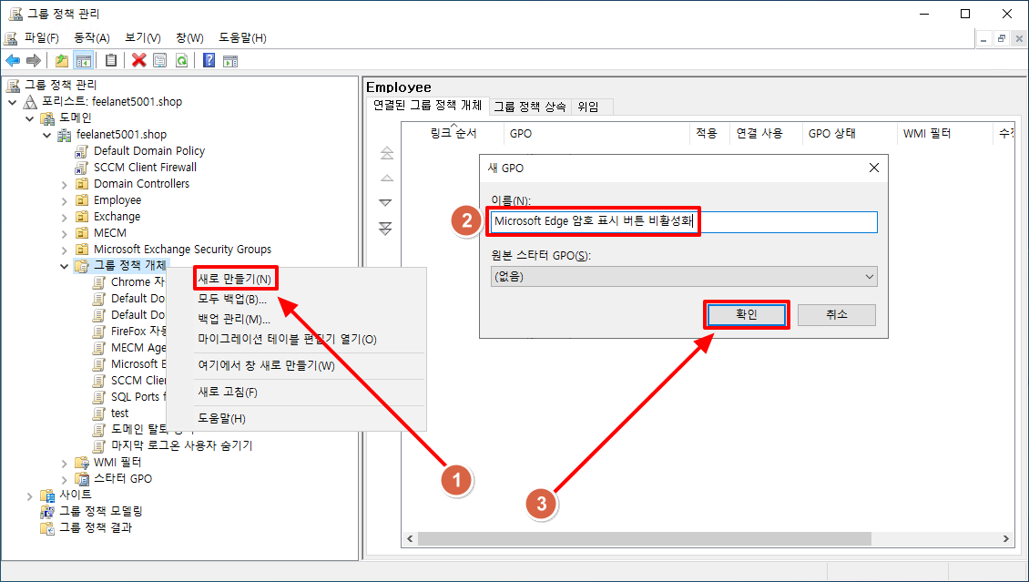 [그룹 정책 개체] 를 우 클릭 후, [새로 만들기] 를 클릭 후, 정책 [이름] 을 입력합니다.