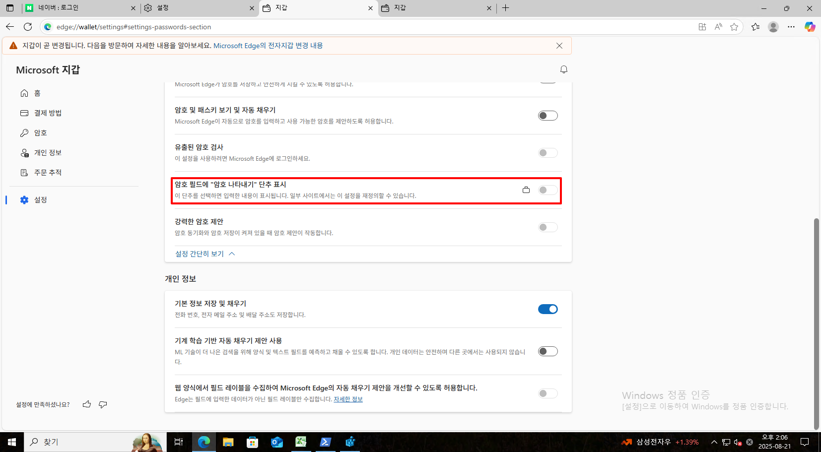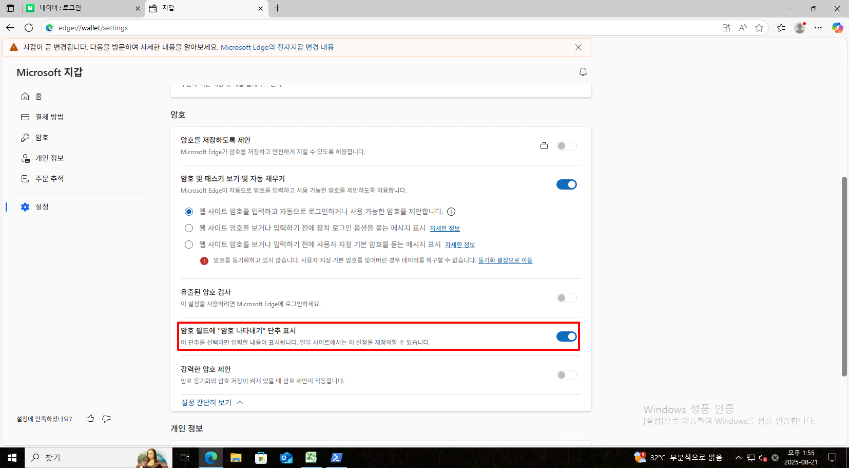 정책 적용 전, [암호 필드에 "암호 나타내기" 단추 표시] 가 활성화 되어 있습니다.