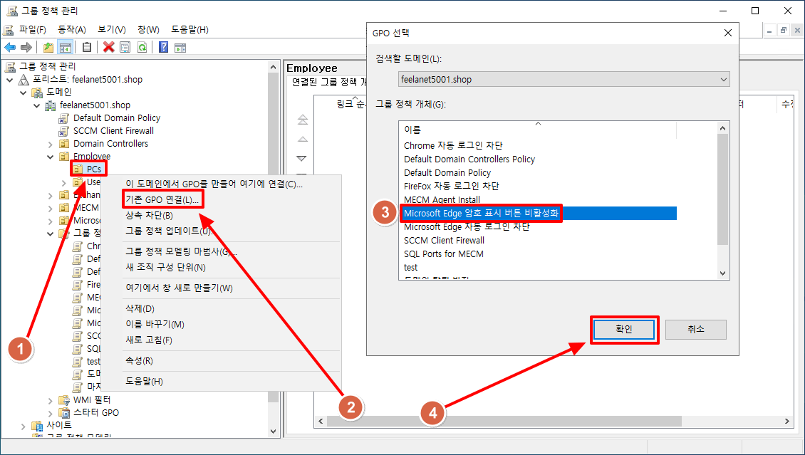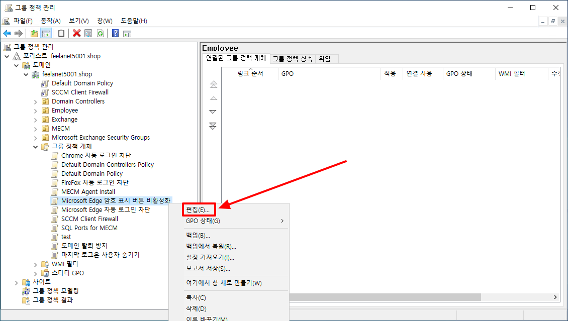 정책을 적용 할 OU 를 우 클릭 후, [기존 GPO 연결] 을 클릭하여, [Microsoft Edge 암호 표시 버튼 비활성화] 정책을 선택합니다.