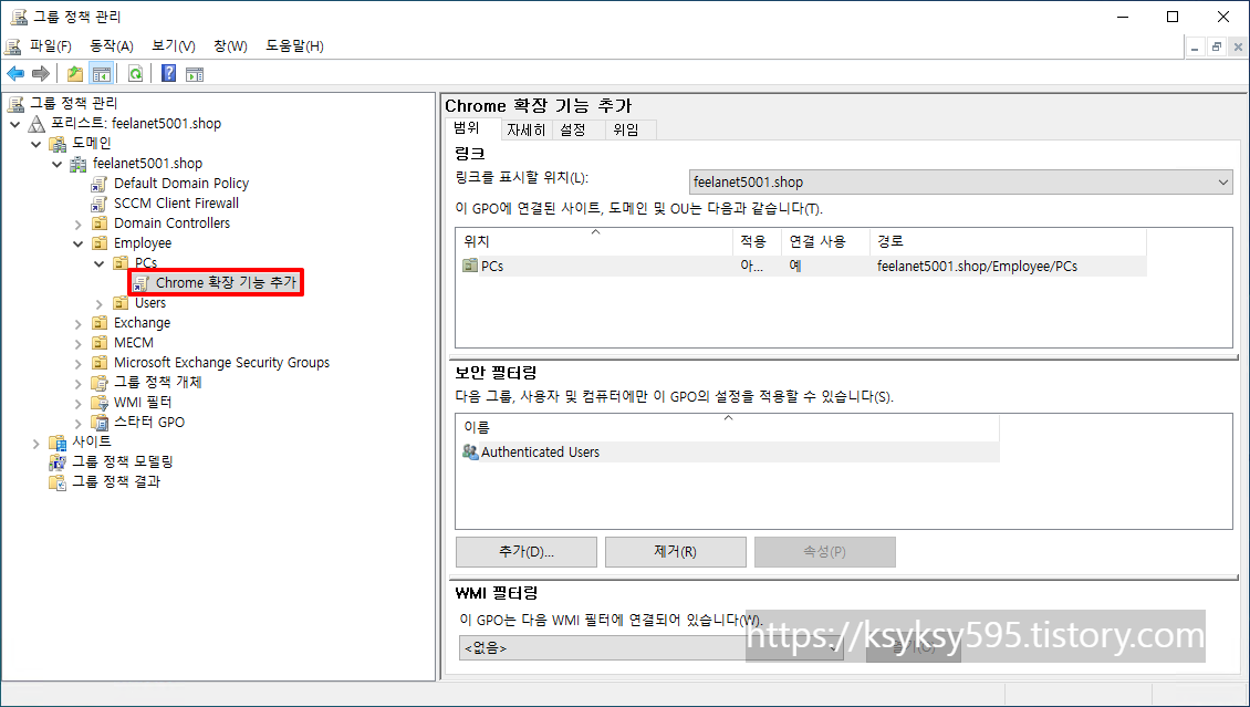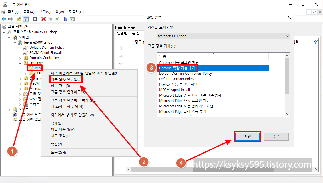 정책을 적용 할, OU 를 우 클릭 후, [기존 GPO 연결] 을 클릭하여, [Chrome 확장 기능 추가] 정책을 선택합니다.
