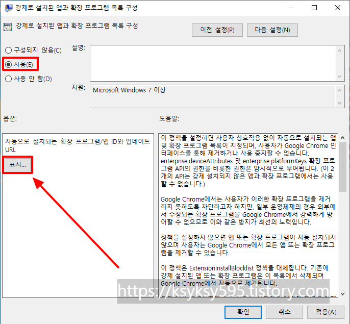 정책 설정을 [사용] 으로 선택 후, [표시] 를 클릭합니다.