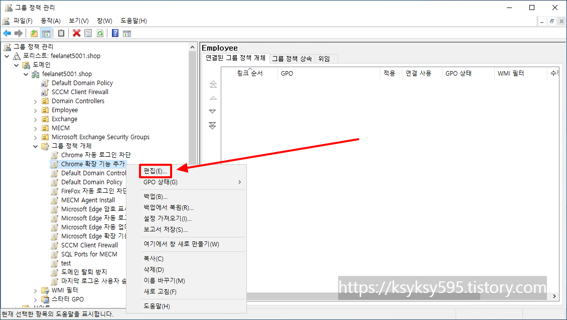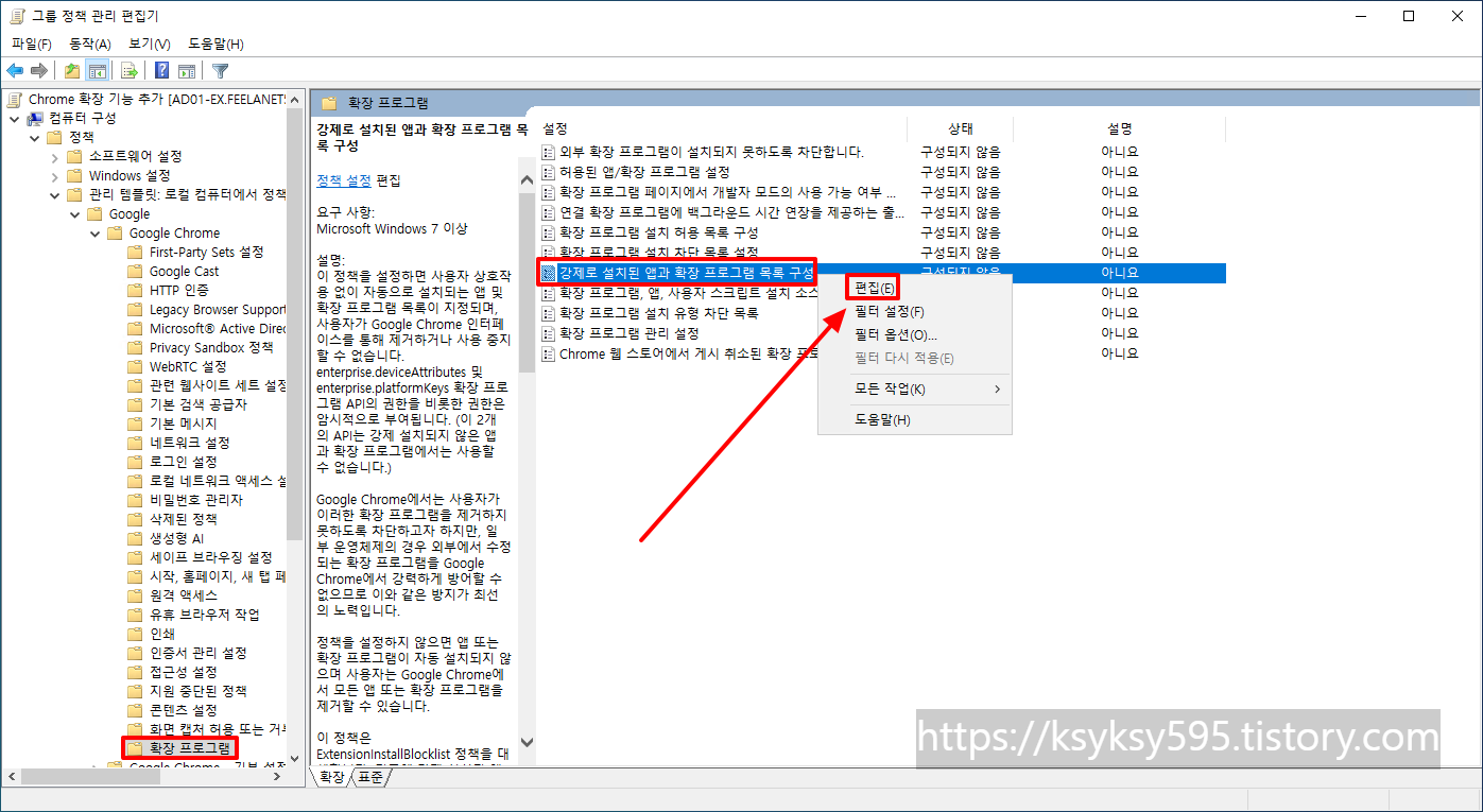 [컴퓨터 구성] --> [정책] --> [관리 템플릿] --> [Google] --> [Google Chrome] --> [확장 프로그램] 으로 이동 후, [강제로 설치된 앱과 확장 프로그램 목록 구성] 을 우 클릭 하여, [편집] 을 클릭합니다.'