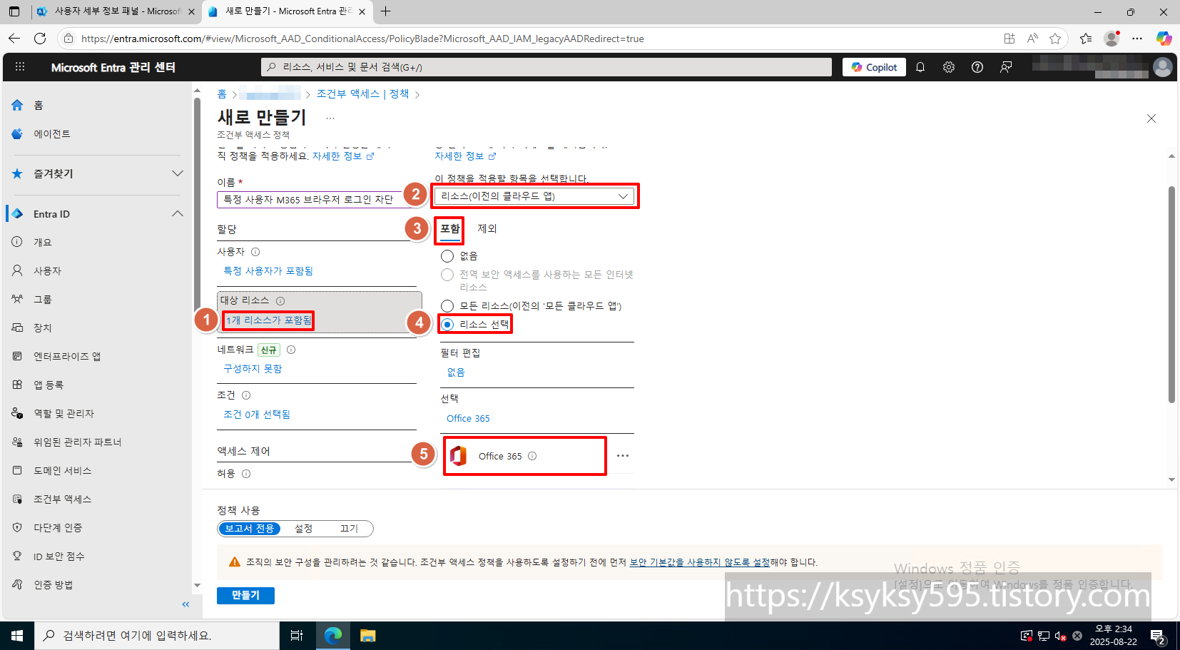 [대상 리소스] --> [리소스(이전의 클라우드 앱)] --> [포함] --> [리소스 선택] 에서 [Office 365] 를 선택합니다.