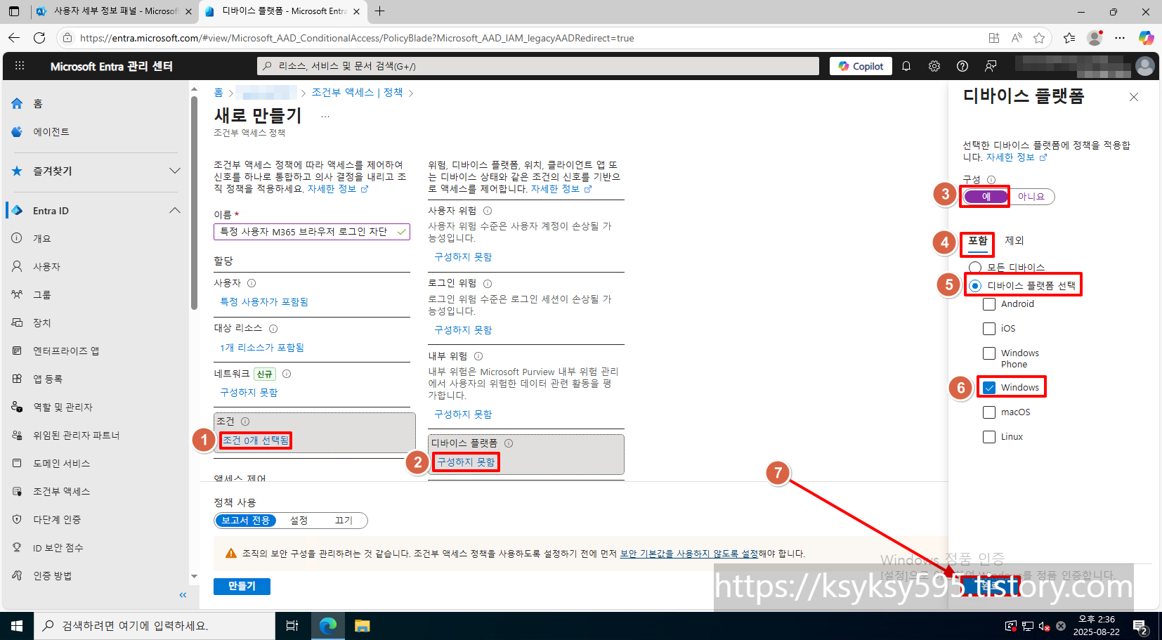 [조건] --> [디바이스 플랫폼] --> [구성(예)] --> [포함] --> [디바이스 플랫폼 선택] --> [Windows] 를 선택합니다.