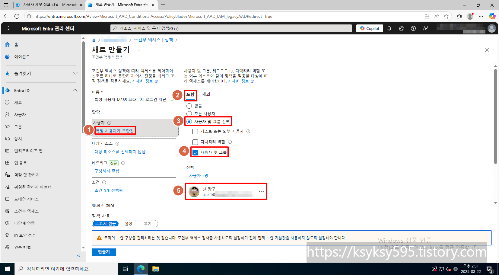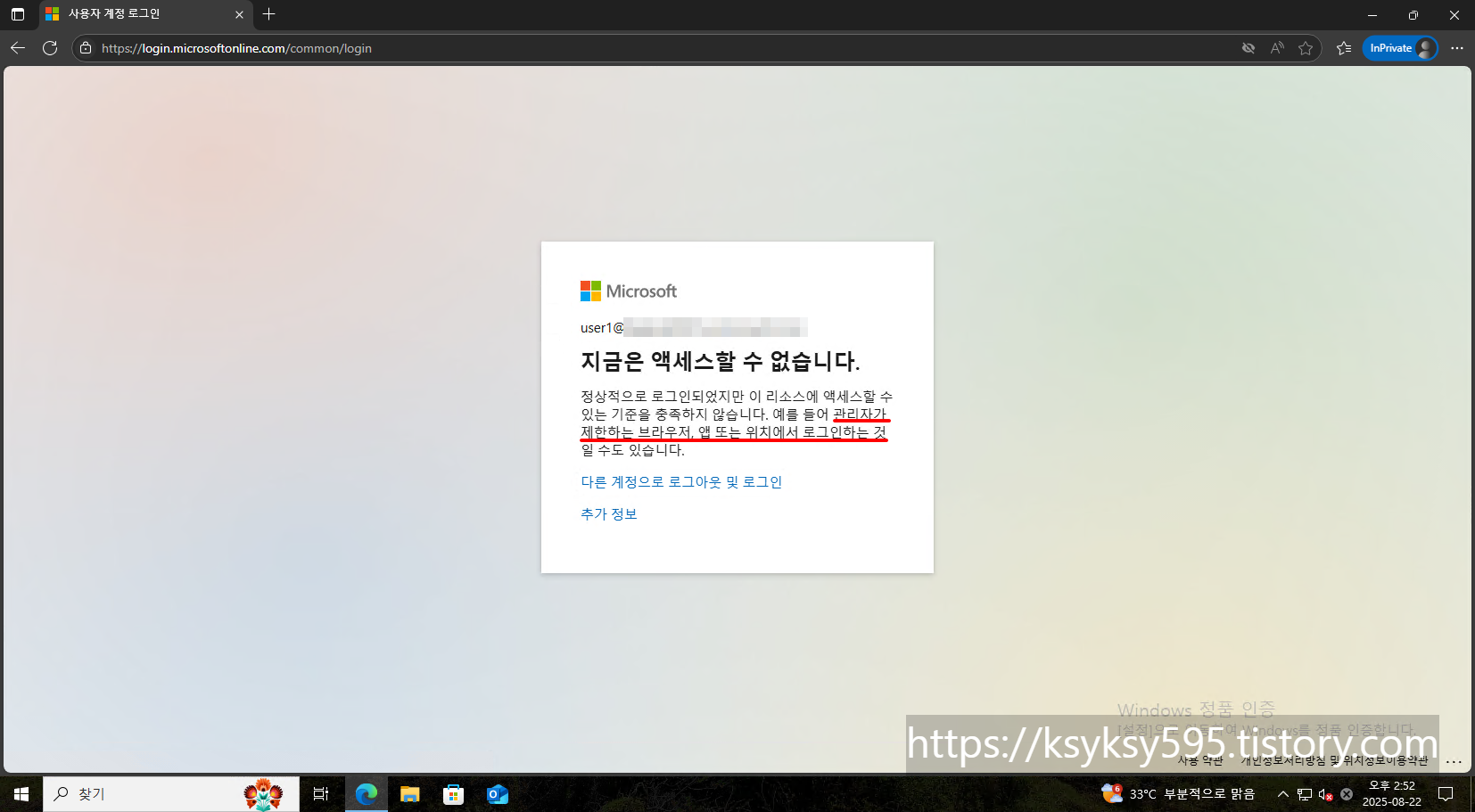 정책에 포함된 사용자는 M365 브라우저에 로그인 할 수 없습니다.