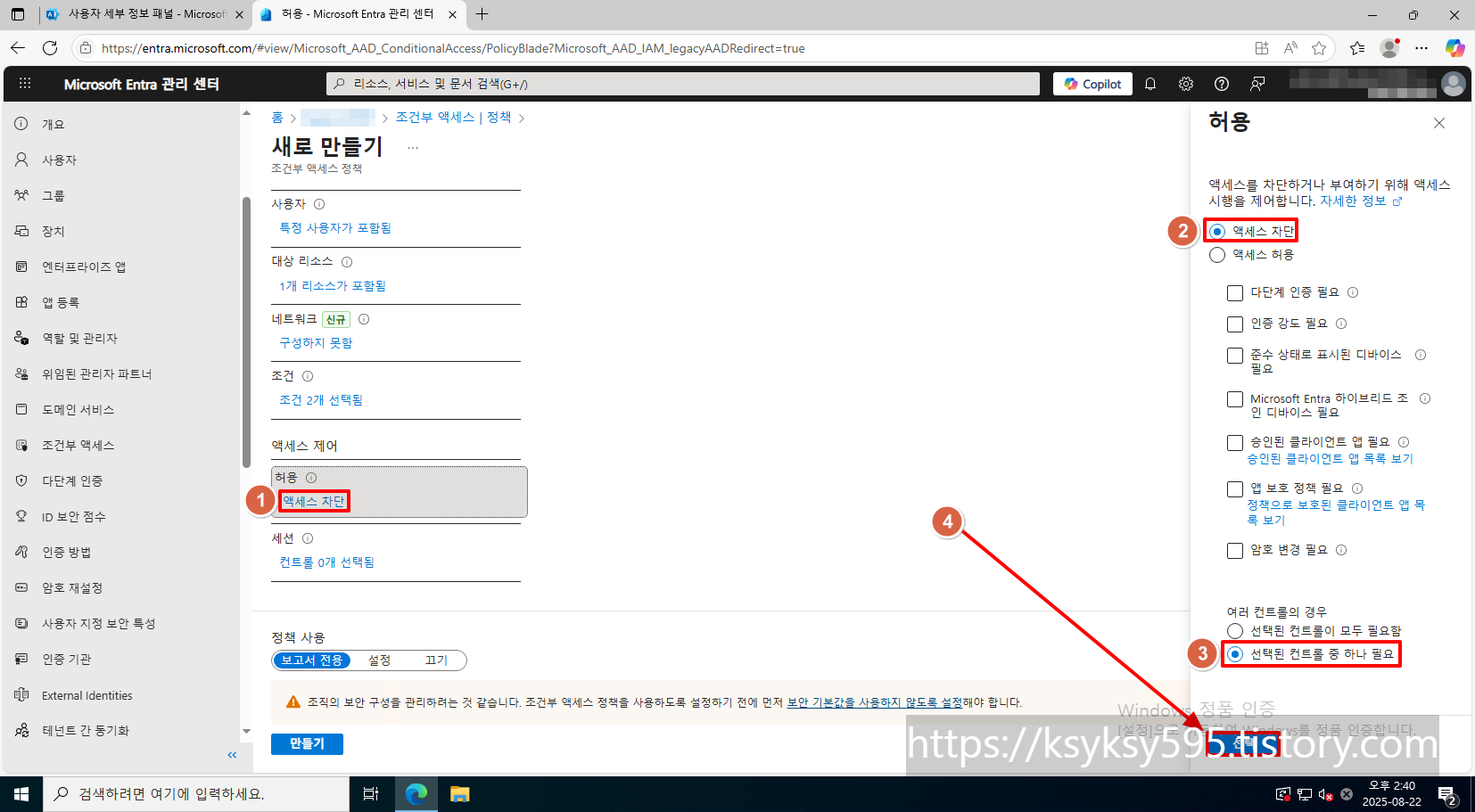 [허용] --> [액세스 차단] --> [선택된 컨트롤 중 하나 필요] 를 선택합니다.