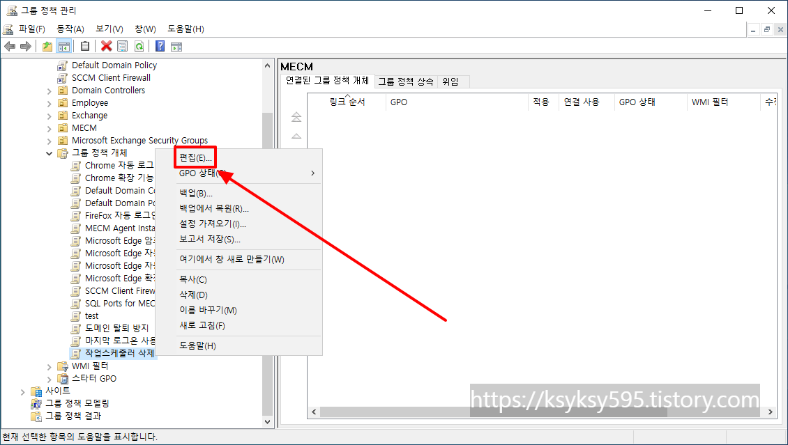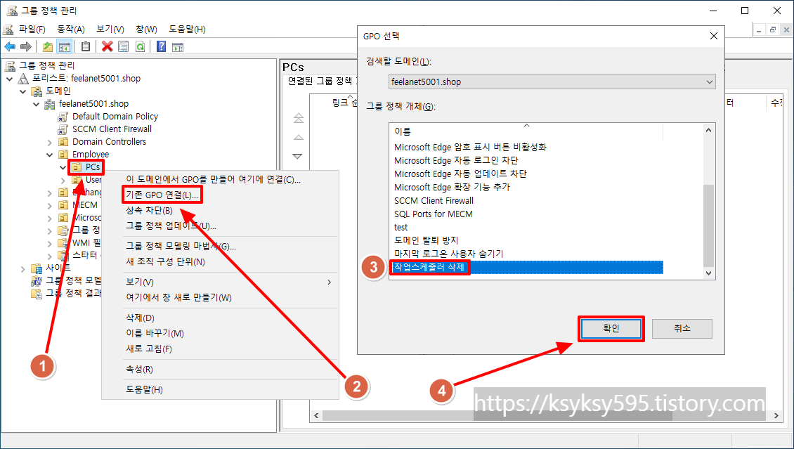 정책을 적용, OU 를 우 클릭 후, [기존 GPO 연결] 을 클릭하여, [작업스케줄러 삭제] 정책을 선택합니다.